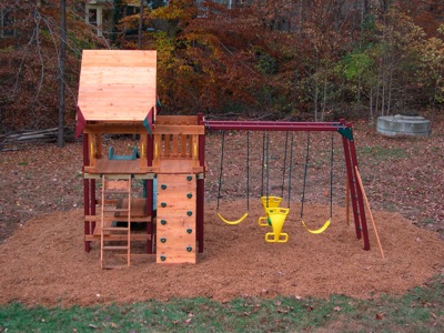 A good friend of mine Nan Ripley asked about what we were doing with our backyard. We were fortunate enough to get a very large water easement behind our house. We lost a lot of the pine trees after an ice storm. (We also lost power for 6 1/2 days... That was not fun!) After clearing off the pines, it was decided that the best use of the space was a playground... After much ado, the boys finally got their playground. As you can see from the picture, they are making great use of it! (*SMILE*)